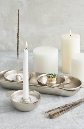Instantly create ambiance with our simple and elegant Stinson Incense/Candle Tray Set. A low trough-style tray and the three round dishes in it are all made from sand-cast aluminum with nickel-plated finish.The tray features a smooth, ear-like handle at each end for style and portability, and a slightly textured exterior resulting from the casting process. One round dish is designed to safely hold a stick of incense in its center island, while a second round dish provides a sturdy base for a single taper candle. The third round dish features a textured striking surface on the bottom of the central well that holds matchsticks, and a moat around it where used matches can cool. Taper holder and match striker dishes include a tab handle for safe and easy placement. Note that match striker requires the use of strike-anywhere matches. Taper candle, incense stick and matches not included. Set is also available in an antique brass finish.