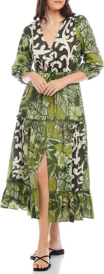 Flouncy tiered ruffles add graceful movement to this breezy cotton maxi covered in a bold leafy print.