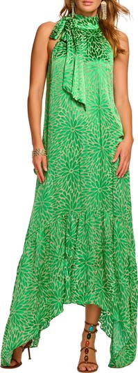 Velvety burnout blooms enhance the texture of this flowy silk-enriched maxi made with a polished neck tie and finished with a drapey handkerchief hem.