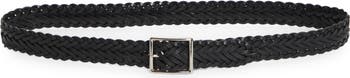 A gleaming square buckle shines against the intricately braided calfskin of this Italian-crafted belt.