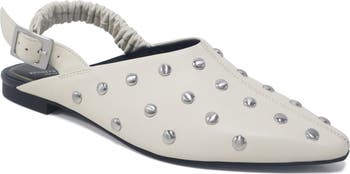 Burnished studs add unmistakable modern edge to a lightly-cushioned mule complete with a practical and stylish slingback strap.