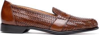 A woven texture enriches the look of a leather loafer handcrafted in Italy to bring an elevated detail to casual or semiformal occasions.