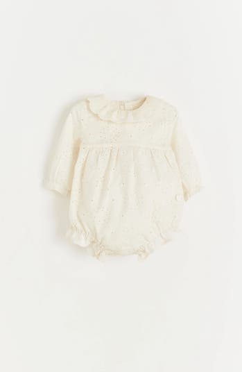 A bodysuit made of embroidered cotton with an invisible zipper at the center back for easy access. The style is long-sleeved, with an embroidered appliqué collar at the neckline and small ruffles at the sleeve ends. The garment is fully lined in soft cotton fabric. Its quality provides softness and comfort for delicate baby care. A lovely garment to dress your baby.