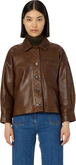 Short and loose jacket made of aged leather with an overshirt spirit. Over a dress, it will play on the masculine-feminine side. Its rich color will blend with a wide palette of shades.