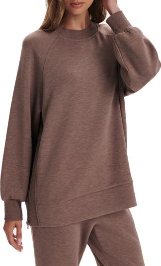 A heathery and lightweight knit keeps you covered in this oversize sweatshirt made with raglan sleeves and sporty zipped side vents.