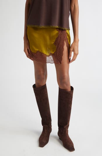 Each season, the Turkish brand whisks us away to Siedrés—an imaginary Mediterranean town you might breeze through in this crinkled satin miniskirt that reveals sultry flashes of skin beneath romantic floral lace.