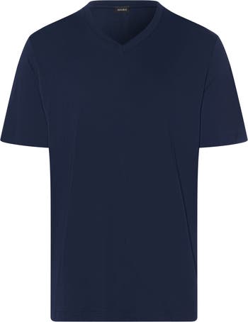 This basic T-shirt with a masculine V-neck is particularly soft and light against the skin. The summery fabric is made from equal parts eco-friendly TENCEL™ Modal and breathable cotton. TENCEL™ Modal is obtained from the renewable raw material wood and gives textiles long-lasting softness and strong, vibrant colors. The short-sleeved t-shirt can be paired with a variety of leisure looks or pajamas. Various shorts and pants in matching colors and prints are available to complement this solid-colored all-rounder.
