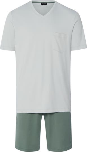 - Sporty styling make the HANRO Night & Day Short Sleeve Pajamas versatile - perfect for sleeping in, or using as separate pieces to mix and match with other items from the Night & Day range. Tailored from 100% cotton, this pajama set includes a short-sleeved shirt with athletic v-neckline and chest pocket, plus pajama shorts with a covered elastic waistband for a custom fit.