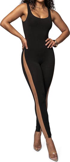 A sleek figure-sculpting jumpsuit is crafted with comfortable and shapely stretch and accented with contrasting sides that reveal a skin-showing illusion.