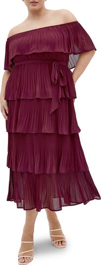 Rows of released pleats create a charming, flowy silhouette in this gorgeous off-the-shoulder maxi dress tethered at the waist by a sash.
