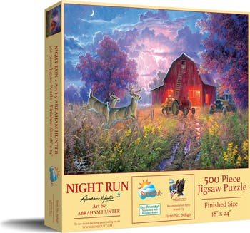 Embark on a mesmerizing adventure with the Night Run 500 pc Jigsaw Puzzle by SunsOut, a woman-owned small business proudly crafting puzzles in the USA. Renowned artist Abraham Hunter's captivating design invites you into a world of natural beauty and wildlife, brought to life with intricate details and vivid colors in a puzzle that measures 18" x 24" once completed. Each precision-cut interlocking piece, made from high-quality recycled cardboard, fits perfectly, promising durability and an enjoyable assembly process that minimizes frustration and maximizes satisfaction. SunsOut reflects a commitment to the environment and sustainable practices by using eco-friendly soy-based inks and premium recycled board. The resulting vibrant artwork presents guilt-free fun with materials that respect our planet. Enjoy peace of mind with a worry-free guarantee that addresses any issues with missing or damaged pieces and experience the quality and precision that comes with American craftsmanship. The tranquility and joy that assembling this nature-inspired puzzle brings makes it perfect for those seeking a peaceful pastime or a gift for a puzzle lover.