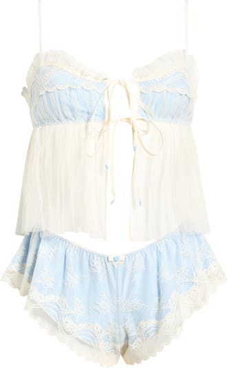 Delicate lace, sweet bows and scalloped edges dial up the romance to the max setting in these pulse-raising pajamas featuring a babydoll-style top and matching minishorts.