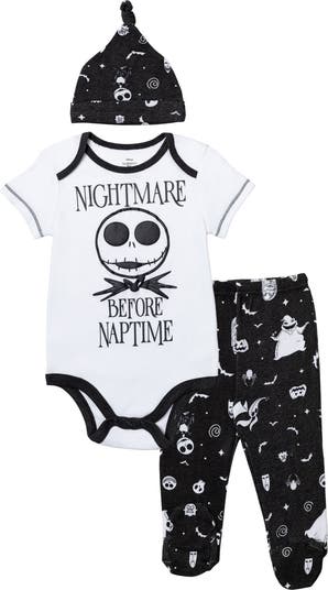 Join Jack Skellington, the Pumpkin King, as he stumbles from Halloween Town to Christmas Town and becomes awed by the festive winter holiday. Help Jack, Sally, Zero the dog, and the other citizens of Halloween Town celebrate and successfully take over Christmas from Santa Claus—without getting Oogie Boogie involved this time! Get your little one ready for this exciting, spooktacular, jolly adventure with this Disney Nightmare Before Christmas Bodysuit & Pants & Hat. Your little one will love this 3 piece mix n' match clothing set: cute and stylish short sleeve bodysuit, pants, and cap so much, they will always want to wear it.