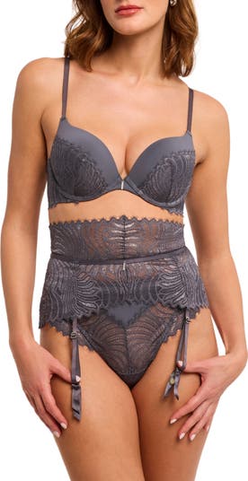 Shimmer-kissed eyelash lace furthers the romantic vibe of this curve-defining garter belt.