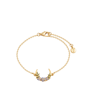 After dark is when the nightshade flower reveals its true beauty, captured in the Nightshade Moon Bracelet. A delicate chain that clasps onto a crescent moon charm and is adorned with hand-painted florals and tiny leaves, it's a unique and original design that has both soul and style. Crafted from 22ct worn gold-plated brass, it's vintage-style finish is perfect for autumn/winter.