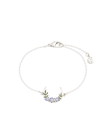 After dark is when the nightshade flower reveals its true beauty, captured in the Nightshade Moon Bracelet. A delicate chain that clasps onto a crescent moon charm and is adorned with hand-painted florals and tiny leaves, it's a unique and original design that has both soul and style. Crafted from worn sterling silver-plated brass, it's vintage-style finish is perfect for autumn/winter.