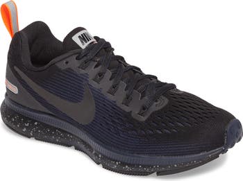 Springy and sprightly, Nike's Air Zoom Pegasus Shield running shoe is built for speed without sacrificing comfort. DWR-treated Flymesh and integrated Flywire cables keep the upper breathable and flexible with consistently secure support—along with water-resistant protection against rain and puddles. Signature Nike Zoom Air units in the forefoot and heel and a flexible tread fitted with a strip of grippy rubber provide durable comfort and traction, even on wet surfaces.