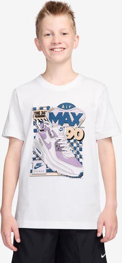 Soft, breathable cotton enhances the comfort of a kid-size T-shirt that kicks up the fun of any activity with the energy of Nike's chunky Air Max 90 sneaker. Perfect for playtime, downtime and every time in between, it makes a great addition to any active wardrobe.