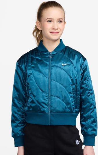 Soft ribbing along the collar, cuffs and hem enhances the comfort of a sporty bomber jacket textured in allover quilting with a shimmery metallic finish.