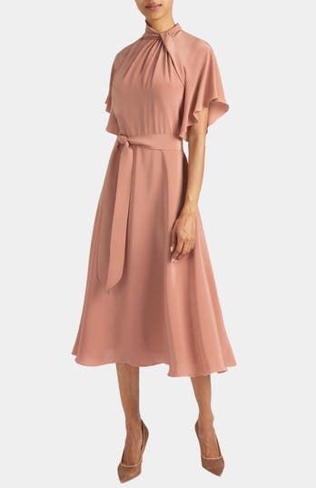 Silk Mock Neck Midi Dress with Short Cape Sleeves