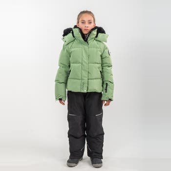 This kids’ ski suit in a soft sage green shade is designed to keep your child warm, comfortable, and protected during winter activities. Made with a durable, water-resistant outer shell and insulated padding, it provides excellent defense against cold, wind, and snow. The jacket features a high collar with a detachable faux fur-lined hood, secure front zipper with snap button storm flap, and multiple zippered pockets including a convenient ski pass pocket on the sleeve. Matching pants ensure full coverage, durability, and freedom of movement, making this suit perfect for skiing, snowboarding, or everyday winter wear. With its modern color and functional design, this ski suit combines performance and fashion to keep your child cozy and confident on and off the slopes.