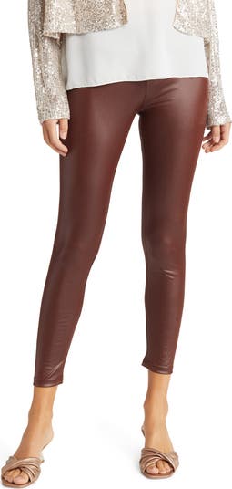 A wide waistband tops these shapely leggings textured in sleek faux leather.