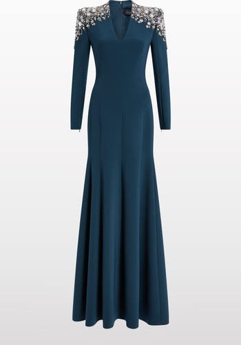 Refined and graceful, this gown showcases a sleek silhouette with delicate shoulder embellishment adding a touch of luminosity. The clean V-neckline and long sleeves balance structure with softness, creating an effortlessly elegant look suited for timeless evening occasions.