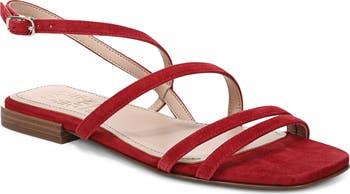 An angular square toe and asymmetric straps shape the striking silhouette of a suede sandal set on a cushioned footbed with enhanced flexibility and shock absorption.