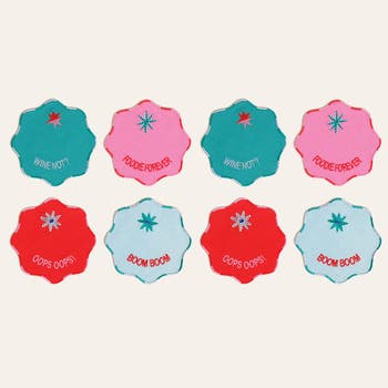 Bold colors, playful expressions, and the soft touch of natural cotton come together. The Nilüfer set of four digitally printed and embroidered 100 percent cotton coasters does more than protect your table. It adds an energetic character to every setting. Produced in Türkiye, these joyful designs come to life through digital prints and refined embroidery details. With playful messages like “Oops Oops!”, “Why Not?”, “Foodie Forever,” and “Boom Boom!”, they make every moment a little more fun and a little more memorable. Mix, match, and let your style speak while serving a drink.