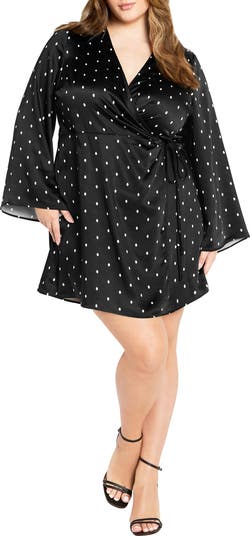 Show off your curves in a flirty wrap dress cut from luminous satin in an allover dot print.