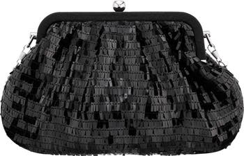 Lustrous sequins and a metallic clasp elevate an event-ready clutch fitted with a drop-in chain strap for hands-free wear.