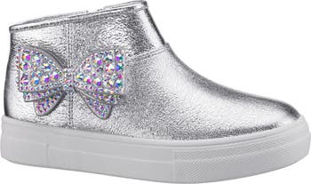 A rhinestone-adorned bow gives a coquettish vibe to a mid-top sneaker built with memory foam cushioning to support their stride from classroom days to weekend outings.
