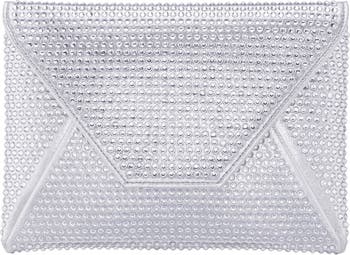 A jewel-encrusted exterior amplifies the glamorous appeal of an evening-ready envelope clutch fashioned with an optional chain strap for hands-free carry.