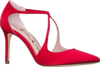 An elasticized instep strap offers a secure fit in an occasion-ready pump framed by a pointy toe and slender heel.