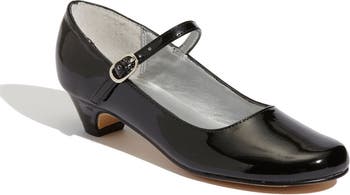 Wrapped kitten heel elevates a glossy mary jane topped with a slim buckle strap.
