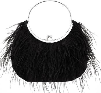 Frothy feathers front this framed handbag lined in silky satin and sealed with a kiss-lock closure. A removable chain strap instantly enhances your carrying options.