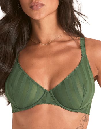 This sheer bra is made of striped mesh with picot lace trim. It features unlined cups, supportive underwire, adjustable straps, and a hook and eye closure, ensuring a perfect fit.