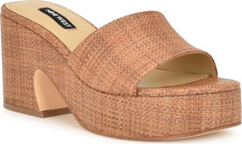 A wrapped platform and block heel lend retro appeal to a chunky slide sandal crafted in a basket-woven design perfect for completing your warm-weather looks.