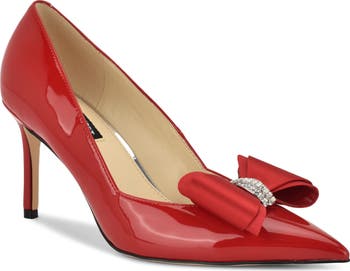 Mixed jewel embellishments center a voluminous instep bow on a pointy-toe pump featuring a streamlined profile and lifted by a dance-ready stiletto heel.