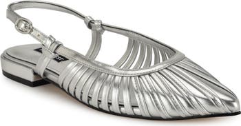 A pointy toe and cage-like upper shape the intriguing silhouette of this slightly-strappy slingback flat.