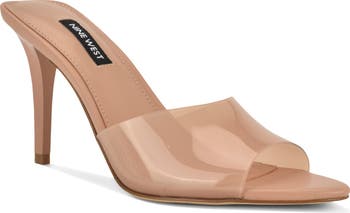 A transparent strap adds a subtle retro twist to a streamlined sandal set on a lofty stiletto heel.