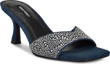A jewel-encrusted upper and V-cut topline add stunning intrigue to a party-ready slide sandal lifted by a tapered heel.