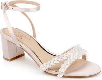 Clusters of pearly beads shimmer at the straps of an elegant ankle-strap sandal perfect for your special day.