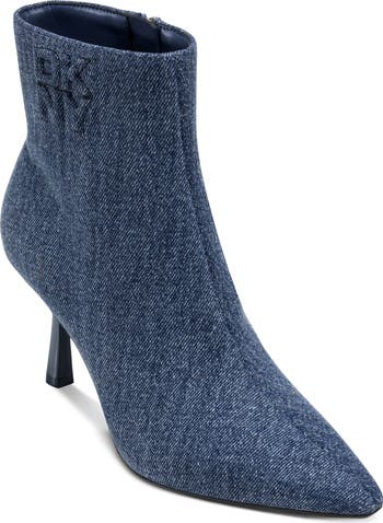 An embossed logo at the side authenticates this streamlined denim bootie balanced on a svelte, sculptural heel.