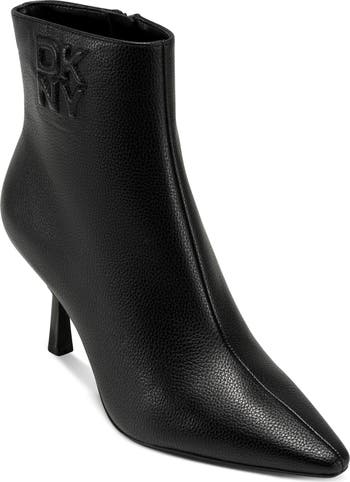 An embossed logo at the side authenticates this streamlined faux-leather bootie balanced on a svelte, sculptural heel.