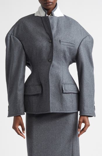 Thom Browne's offbeat twist on the classic women's blazer is made from rich felted wool and cut for a striking hourglass silhouette that's dramatically nipped in at the waist.