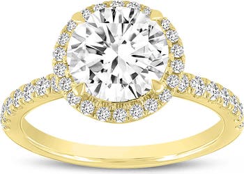 This timeless ring features a stunning 2.45 carat round shaped lab grown diamond ring with a halo and brilliant cut lab grown diamonds along the side. Elegantly made in 14K yellow gold and showcased in a classic four prong setting. Perfect for special occasions including engagements and weddings. The ring is accompanied with an IGI certificate with the certificate number inscribed within the band. Diamond carat weight may fluctuate 0.05 carats ABOVE the stated number.