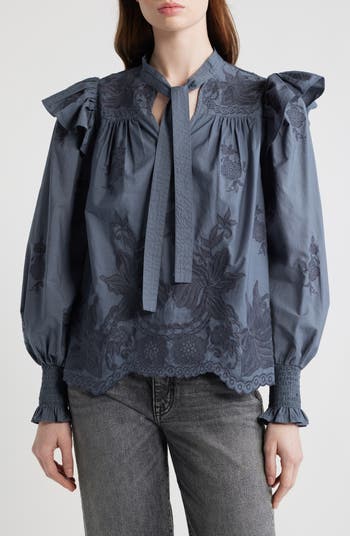 Frothy ruffles detail the shoulders of this all-cotton top detailed with billowy smocked-cuff long sleeves and intricate floral embroidery.