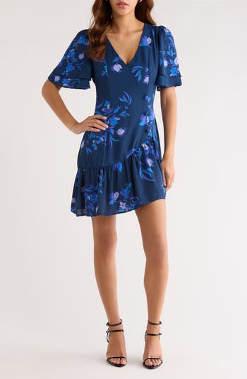 Covered nonfunctional buttons enhance the faux-wrap silhouette of a minidress finished off with pretty floral blooms that bring sweetness with you at every turn.