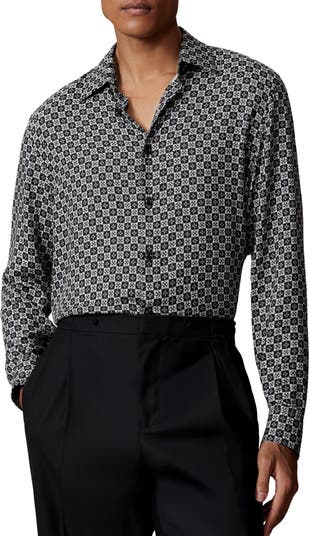 An allover geo print enhances the polish of this crisp shirt cut in a slim fit.